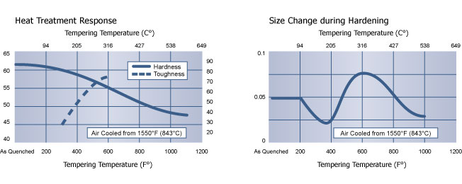 为了最大限度地减小横截面内部应力大于6英寸(152.4 mm)并提高热处理后EDM的工具的稳定性,强烈建议在回火温度下浸泡4到6小时。